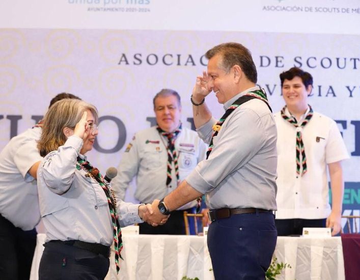Al concluir el acto protocolario, Elvia González Puente, presidenta Nacional de la Asociación de Scouts de México A.C., le colocó al Alcalde la pañoleta nacional scout, la cual cuenta con diversos símbolos referentes a las culturas prehispánicas.