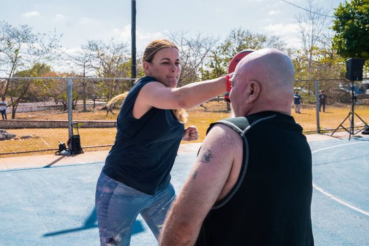 Por la mañana la Diputada Federal participó en un taller de defensa personal con mujeres del oriente de Mérida, donde expresó que aprender autodefensa y generar espacios de aprendizaje para el autocuidado permite fortalecer el tejido social, brindarles más seguridad y confianza.