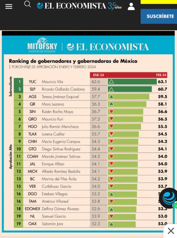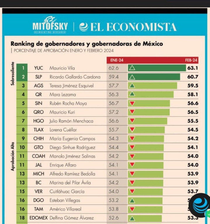 El estudio fue realizado por la Consultora Mitofsky para el periódico El Economista, y le acompañan en el pódium de los tres mejor evaluados los gobernadores de San Luis Potosí, Ricardo Gallardo Carmona, con 60.27% y de Aguascalientes, Teresa Jiménez Esquivel, con 59.5% de aprobación ciudadana.