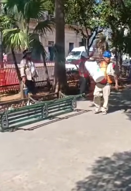 El Gobierno municipal, en coordinación con el Gobierno de Yucatán, llevó a cabo el retiro de la infraestructura urbana siguiendo los protocolos de seguridad para evitar dañar tanto las bancas como las sillas confidentes, y así poder continuar con las obras de remodelación de la Plaza Grande.