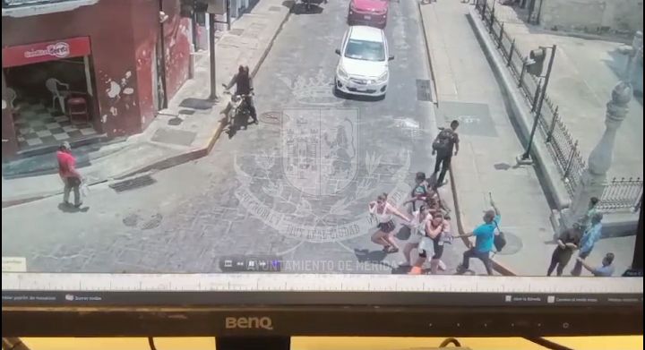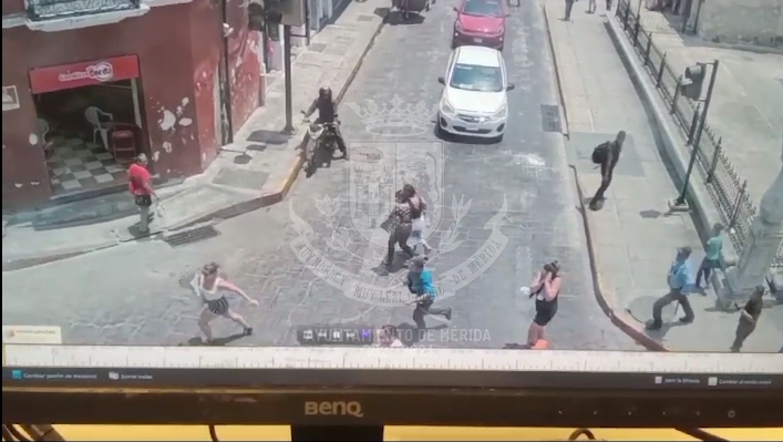Los hechos se registraron este martes a las 11:30 horas, cuando agentes de esta corporación se encontraban realizando su recorrido de seguridad y vigilancia a pie sobre la calle 60 por 61 y 59 centro, cuando al escuchar un ruido se percataron que la turista L.M. se tocaba la cabeza y Eliasin M.S. estaba amenazando a sus acompañantes con un martillo con hacha. De manera inmediata los agentes policiales intervinieron, procediendo a la detención del agresor.