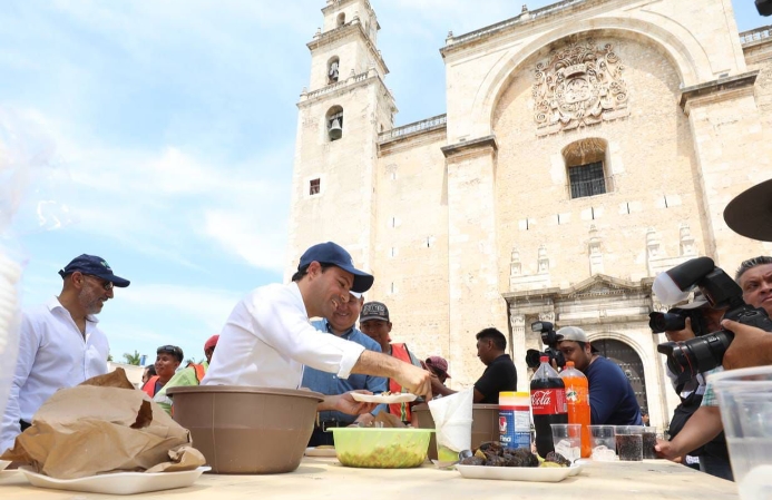 Sentados en una zanja bajo la sombra de uno de los árboles del lado oriente de Plaza Grande, justo frente a la Catedral de Mérida, el Gobernador y los alarifes, quienes hicieron una pausa de sus labores, degustaron de unos tacos de este manjar yucateco y se refrescaron un poco frente a la alta temperatura que se registró este día en Yucatán.