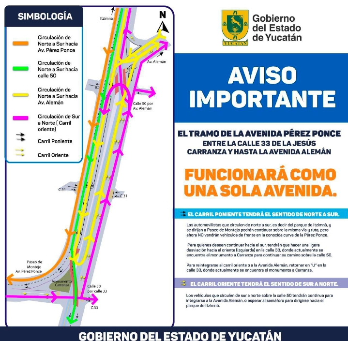 Entre las modificaciones, la Agencia de Transporte de Yucatán (ATY) explicó que se realizan en el polígono que se ubica entre las calles 33, 50 y avenida Pérez Ponce, es decir, el lugar donde antes se ubicaba el busto de Venustiano Carranza, donde se creó un crucero con semáforos mejorando la seguridad para que la gente que antes se dirigía hacia la izquierda pegado a la curva, tendrá que seguir derecho unos cuantos metros más para después girar en esa dirección; mientras que para las personas que circulen sobre la calle 50, podrán seguir derecho.