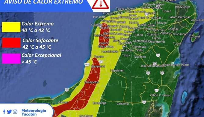 “Históricamente, las temperaturas máximas en Yucatán se han producido en el mes de mayo, llegando por lo general a los 41°C a 43°C, con una máxima registrada de 49.6°C el 21 de mayo de 1995 y el más reciente de 45.5°C el 06 de mayo de 2020”.