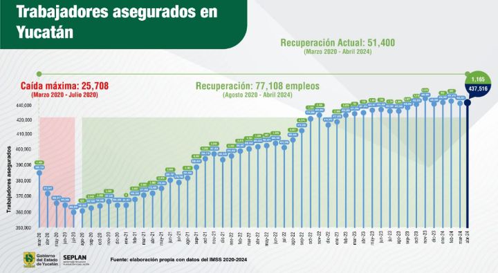 De acuerdo con el indicador del IMSS, entre abril de 2023 y 2024, se generaron 15,700 nuevos empleos, lo que colocó a Yucatán entre los primeros 11 lugares con mayor generación de empleos.