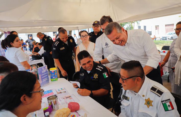 En su recorrido por la Feria de la Salud en el Parque de La Mejorada, el Alcalde también saludo a elementos de la Policía Municipal que acudieron a realizarse estudios de presión, peso y talla, glucosa y de nutrición, entre otros servicios.