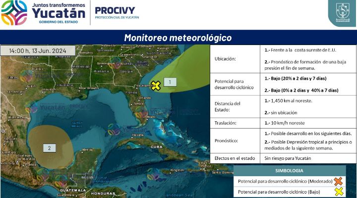 Mérida, 13 de junio de 2024.- Ante la cauda de la primera secuencia de precipitaciones en el estado en esta temporada, la Coordinación Estatal de Protección Civil (Procivy) informa que está vigente la perspectiva de que junio será un mes lluvioso con acumulados de 75 por ciento por arriba del promedio.