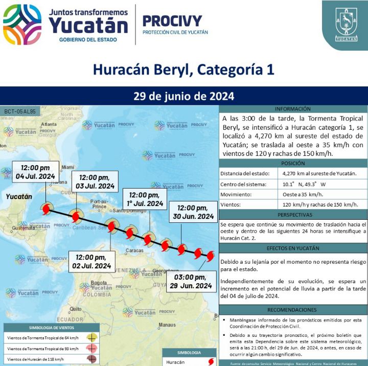 Mérida, 29 de junio de 2024.- La Coordinación Estatal de Protección Civil (Procivy) informa que la Tormenta Tropical “Beryl”, se intensificó a Huracán categoría 1, se localizó a 4,270 km al sureste de Yucatán por lo que hasta el momento no representa riesgo para el estado, pero debido a su pronóstico de trayectoria se mantiene en vigilancia permanente.
