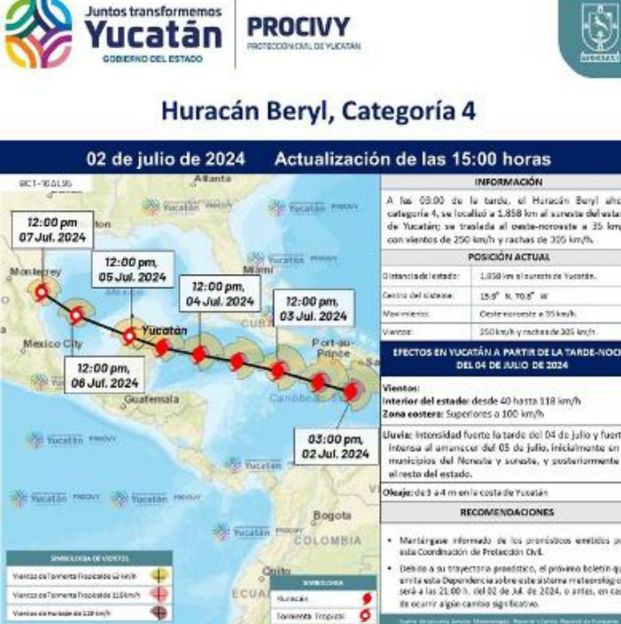 Mérida, 2 de julio de 2024.- Ante la aproximación del huracán “Beryl” a Yucatán, ubicado esta tarde a mil 858 km al sureste del estado con vientos de categoría 4, de 250 km/h y rachas de 305 km/h, la Coordinación Estatal de Protección Civil (Procivy), llama a la población a tomar sus precauciones, resguardarse en sus domicilios o en su caso acudir a los refugios temporales.