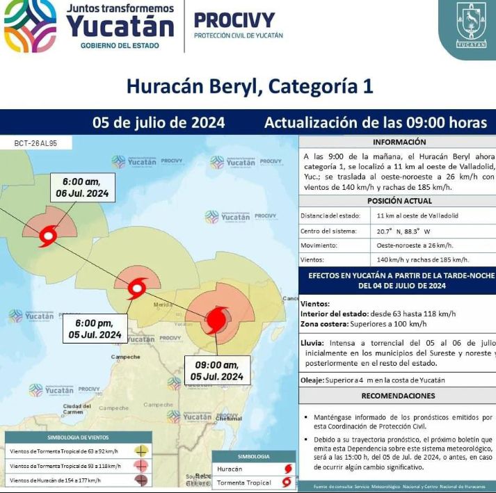 A las 9:00 de la mañana, el #Huracán #Beryl ahora categoría 1, se localizó a 11 km al oeste de #Valladolid, #Yucatán; se traslada al oeste-noroeste a 26 km/h con vientos de 140 km/h y rachas de 185 km/h.
