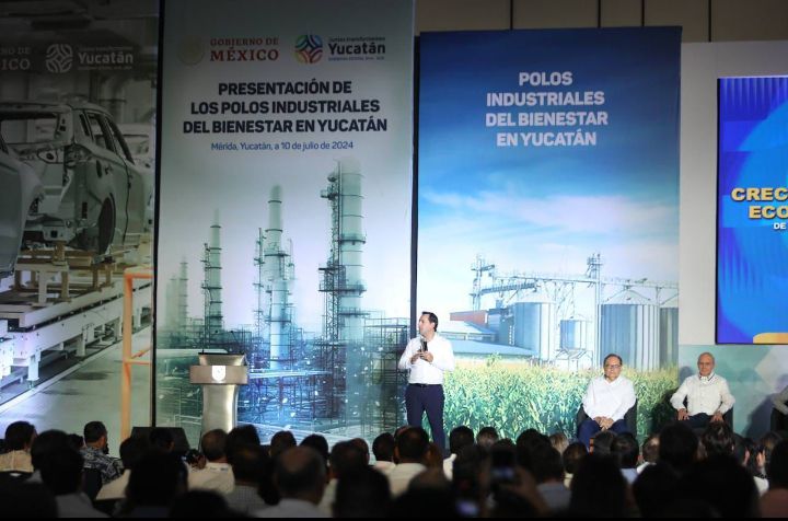 Mérida, Yucatán, 10 de julio de 2024.- El Gobernador Mauricio Vila Dosal, junto con la secretaria de Economía del Gobierno de México, Raquel Buenrostro Sánchez, encabezó la presentación de los dos Polos de Desarrollo para el Bienestar instalados en Yucatán, proyectos que se lograron como resultado de las gestiones del Gobernador ante la Federación y que se convertirán en un importante detonante del desarrollo de la entidad y la llegada de nuevas inversiones en 11 ramas de la industria, mismas que generarán fuentes de empleos para las familia yucatecas.