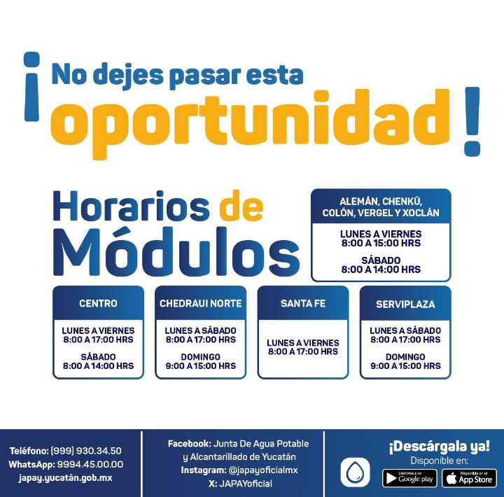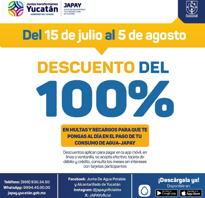 Este descuento será válido hasta el 5 de agosto próximo y se realizará de manera directa a la hora de realizar el pago en los módulos de atención, en línea desde japay.yucatan.gob.mx, en la aplicación de la Junta o vía WhatsApp al 9994 45 00 00.