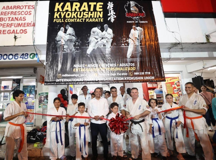 Mérida, Yucatán, 14 de agosto de 2024.- Niños, jóvenes y adultos del oriente de Mérida tienen una nueva opción para practicar las artes marciales al abrir sus puertas el Rabbone Dojo, espacio en donde se enseña el karate kyokushin y a cuya ceremonia de apertura la noche de ayer martes acudió el Gobernador Mauricio Vila Dosal.