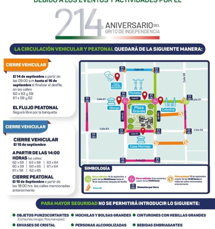 Para el domingo 15, la corporación policíaca detalló que a partir de las 14:00 horas se restringirá el tránsito vehicular sobre las calles 62 con 59, 60 con 59, 63 con 58, 60 con 65, 62 con 65, 63 con 64 y 61 con 64. A las 18:00 horas, también se suspenderá el flujo peatonal sobre estas mismas arterias. Para las 19:00 horas iniciará el ingreso del público hacia las inmediaciones del Palacio de Gobierno y la Plaza Grande para la celebración del tradicional Grito.