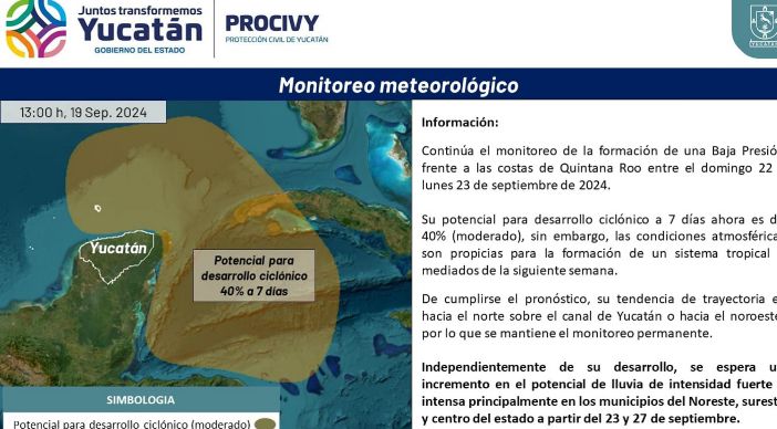 Mérida, 19 septiembre de 2024.- Un temporal de lluvia de diversa intensidad a partir del lunes 23 y hasta el viernes 27 de septiembre en la mayor parte del territorio estatal, asociado a un sistema tropical en el Caribe mexicano con potencial ciclónico, informó la Coordinación Estatal de Protección Civil.