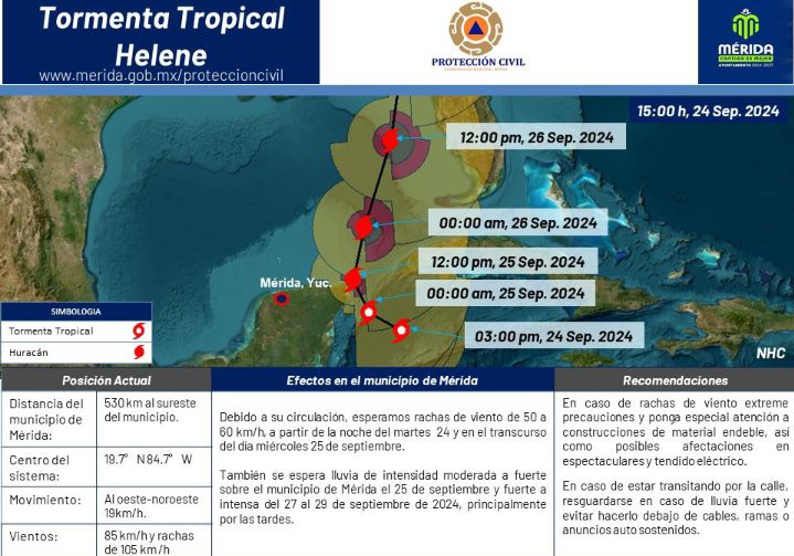 De acuerdo con la información emitida por Comisión Nacional del Agua y Protección Civil Estatal, aunque la trayectoria de la tormenta tropical “Helene”, sería por el canal de Yucatán y, por lo tanto, a aproximadamente 400 km de su punto más cercano respecto a Mérida, se espera que el miércoles 25 de septiembre entre las 5 y 7 de la mañana se presenten lluvias intensas , por la interacción de diferentes fenómenos meteorológicos en la región que ocasionan una amplia zona de inestabilidad atmosférica.