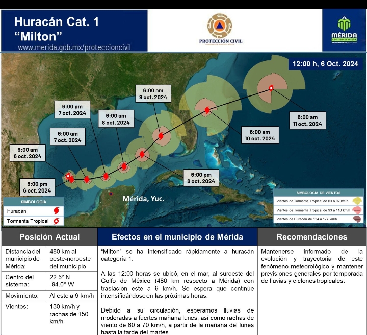 Ante la presencia del Huracán “Milton” de categoría 1 en el Golfo de México y su desplazamiento hacia el este, así como la alerta verde generada por el Sistema Nacional de Protección Civil, el Ayuntamiento de Mérida, a través de la coordinación municipal de Protección Civil mantiene en estrecha vigilancia este fenómeno meteorológico y monitoreo permanente de los pronósticos, en estrecha coordinación con la Comisión Nacional del Agua. Así lo confirmó el coordinador municipal de protección civil, Jesús Enrique Alcocer Basto.