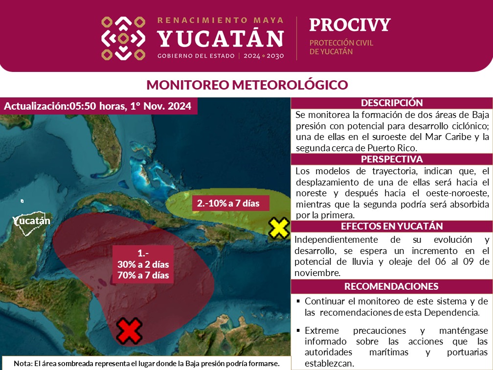 Se mantienen en vigilancia dos áreas de Baja Presión localizadas en el Mar Caribe, ambas con potencial de desarrollo ciclónico, una de ellas se encuentra frente a las costas de Panamá a unos 1,300 kilómetros al Sureste de Yucatán y la segunda cerca de Puerto Rico a 2,300 km al Este del Estado, informó la Coordinación Estatal de Protección Civil (Procivy).