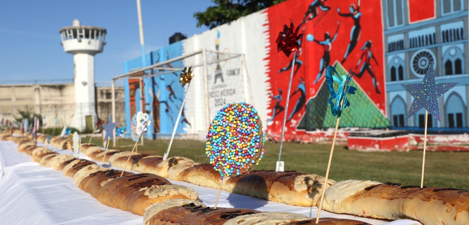 Una gran Rosca de Reyes de 400 metros de largo, elaborada por 40 panaderos privados de la libertad, fue el motivo para que tuviera lugar un alegre convivio en el Centro de Reinserción Social (CERESO) de Mérida, como parte de las acciones que lleva a cabo el Gobierno encabezado por Joaquín Díaz Mena para promover la reinserción social de las personas privadas de su libertad, al acercarles a actividades deportivas, educativas, artísticas, culturales, de salud y laborales.
