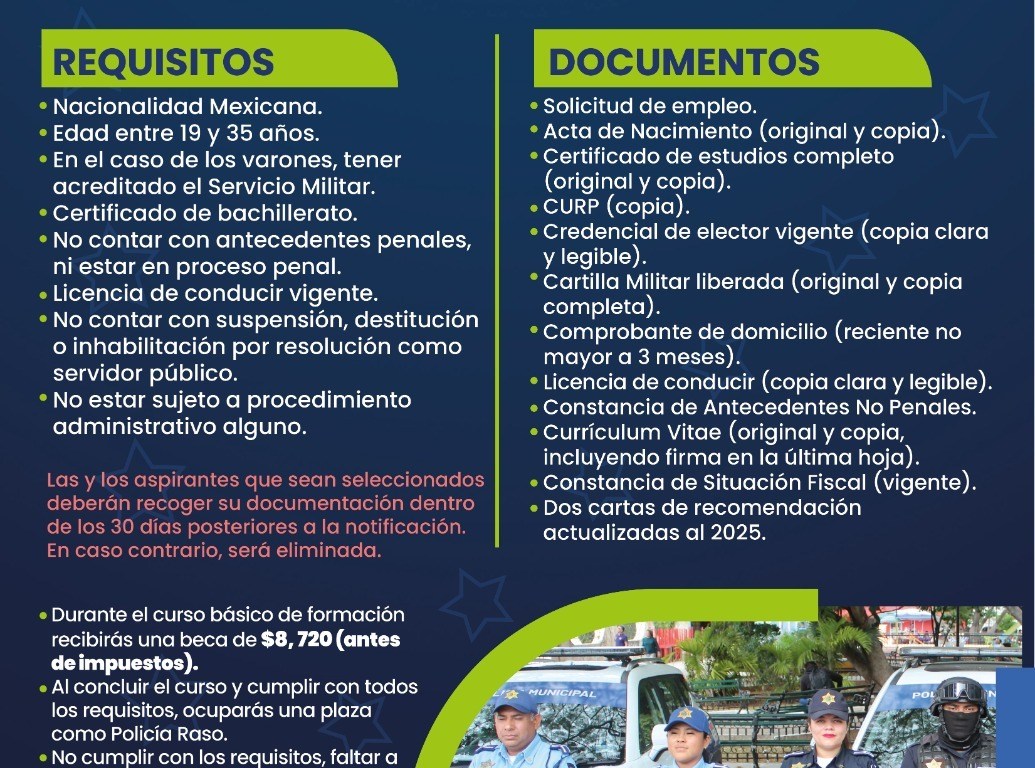Las personas interesadas en formar parte de nuestro personal operativo es indispensable que cubran los siguientes requisitos: tener de 19 a 35 años edad; contar con certificado de estudios de Bachillerato; en el caso de hombres tener acreditado el Servicio Militar Nacional; aprobar los exámenes de selección; no estar sujeto a ningún proceso penal; licencia de conducir vigente; no contar con suspensión, destitución o inhabilitación por resolución como servidores públicos; y no estar sujeto a procedimiento administrativo alguno.