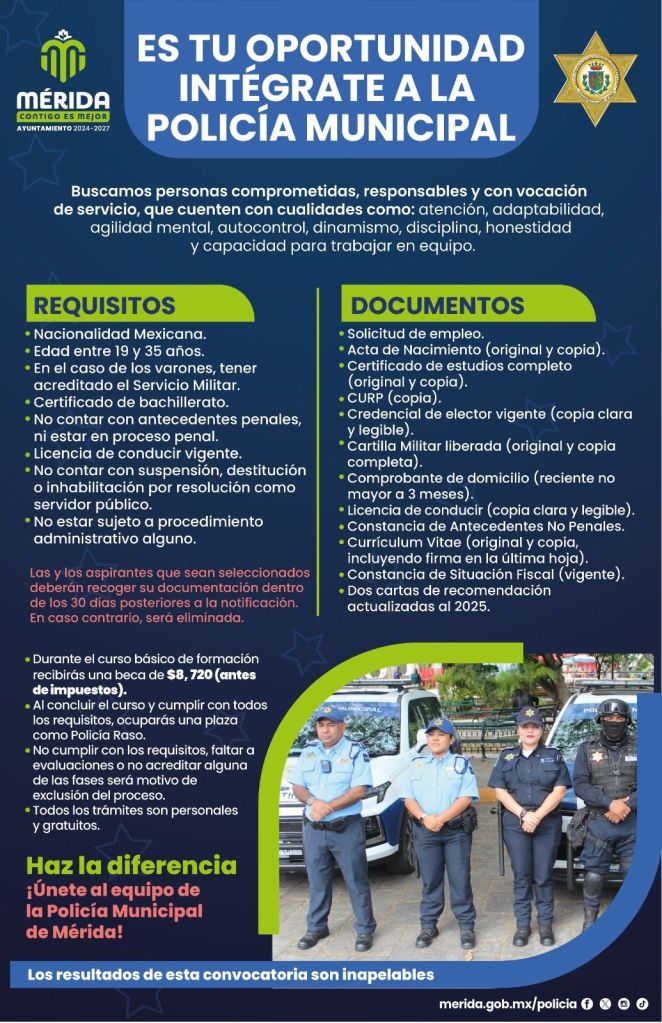 La Dirección de la Policía Municipal de Mérida convoca a las ciudadanas y ciudadanos interesados en servir a la sociedad realizando labores de seguridad, tránsito y prevención, a participar en el proceso de reclutamiento y selección para iniciar su proceso de formación como cadetes de policía, y posteriormente fungir como agentes de esta corporación policial.