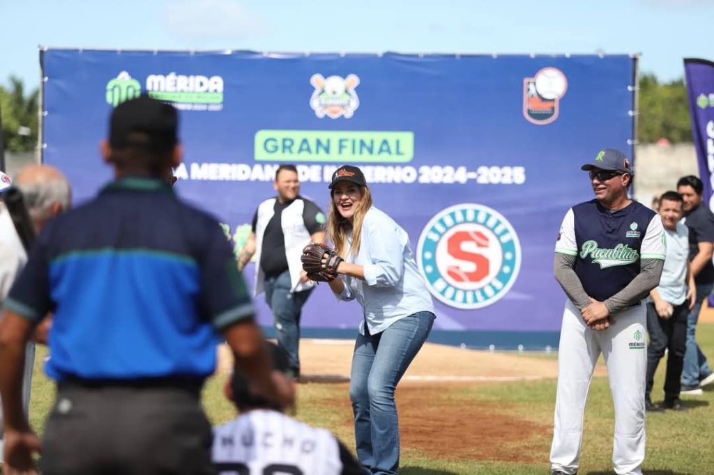La Presidenta Municipal de Mérida, Cecilia Patrón Laviada, realizó el lanzamiento de la primera bola de la serie final de la Liga Meridana de Invierno