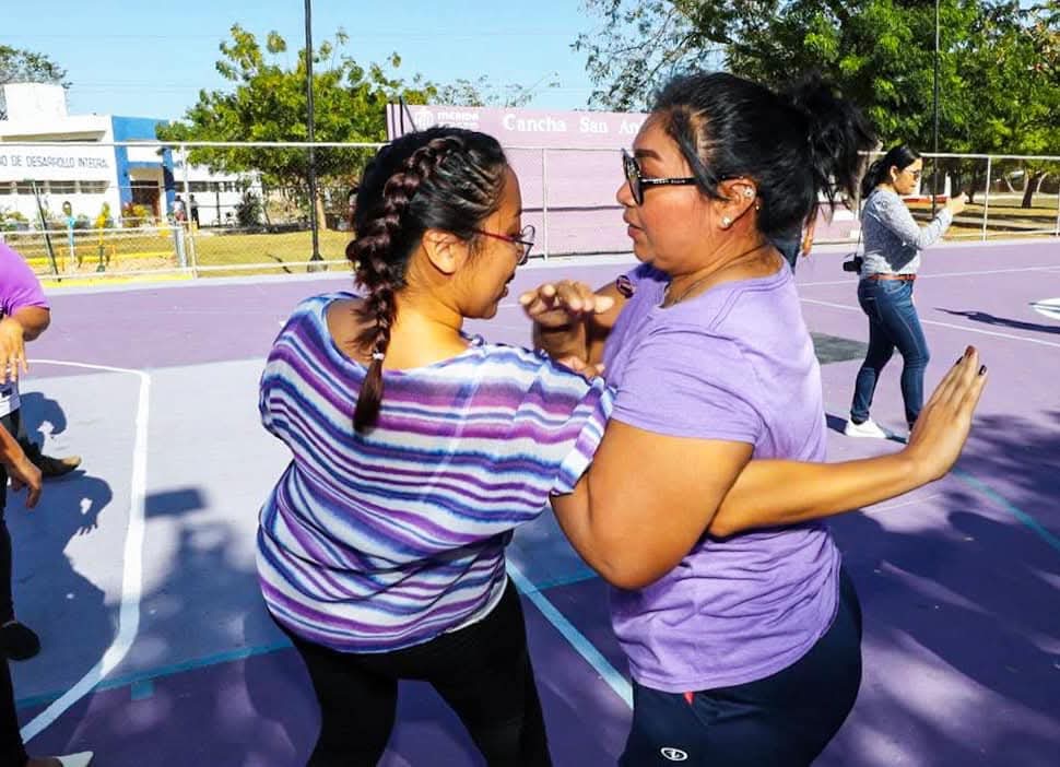 “Hoy me siento muy contenta de poder conmemorar el 8M con esta actividad en la primera cancha “Aliadas” pintada de color morado que representa la lucha de todas las mujeres por sus derechos. Además, esta clase de defensa personal es una herramienta para que las mujeres tengamos los conocimientos de cómo defendernos”, señaló Yahayra Centeno Ceballos, directora del Instituto de las Mujeres.