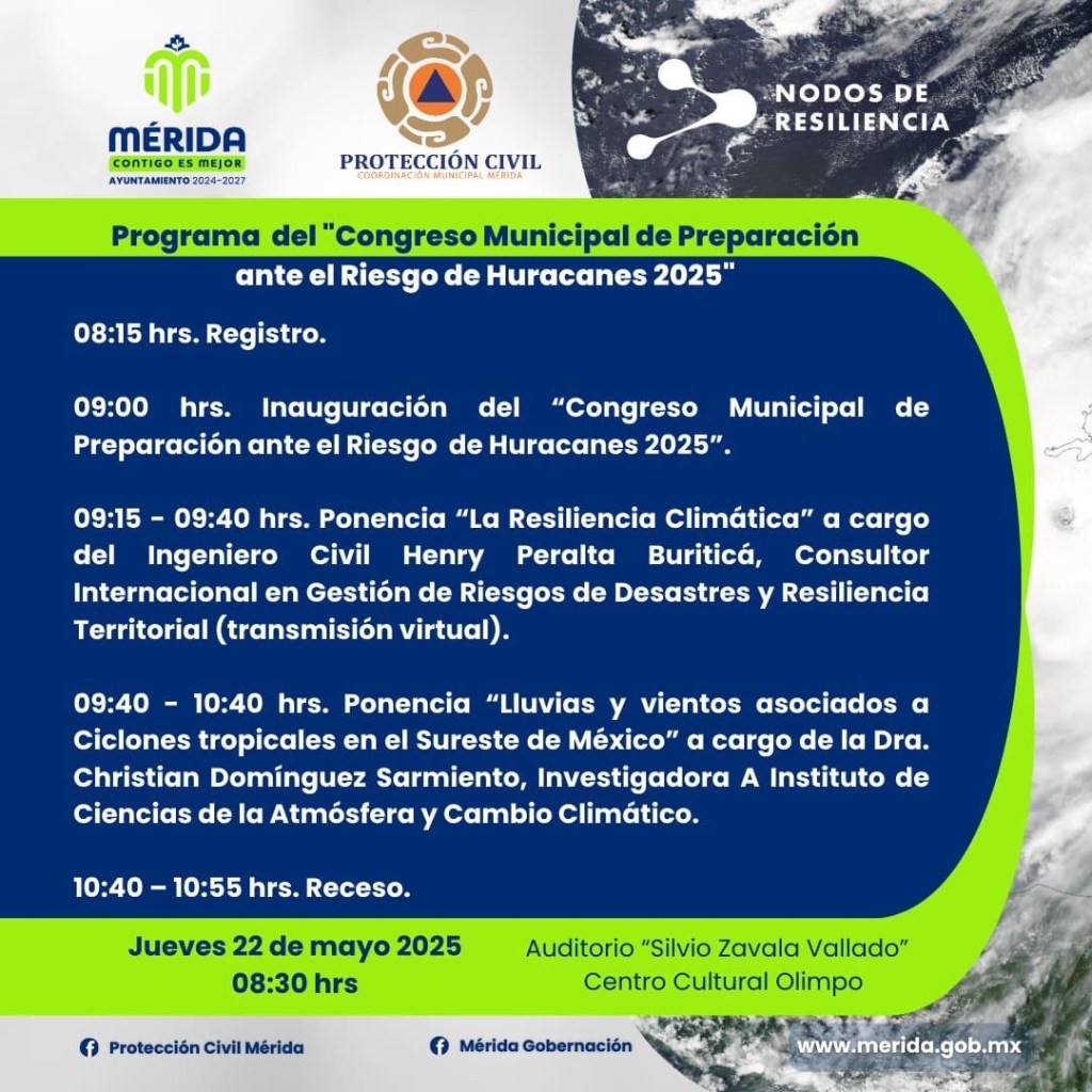 Mérida, Yucatán a martes 20 de mayo de 2025.- El Ayuntamiento que encabeza Cecilia Patrón Laviada, a través de la Coordinación de Protección Civil Municipal, invita a la ciudadanía a participar en el «Congreso Municipal de Preparación Ante el Riesgo de Huracanes Mérida 2025».