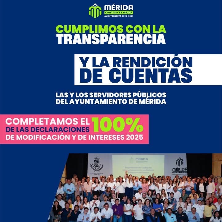 “Este logro refleja el trabajo conjunto de quienes integran al Ayuntamiento de Mérida por construir un gobierno abierto, honesto y cercano a la gente. Porque cumplir con la ley y las responsabilidades públicas también es una forma de servir mejor a la ciudadanía, como lo hemos hecho desde el día uno en esta nueva forma de gobernar, con orden, justicia social y transparencia”, expresó la alcaldesa.