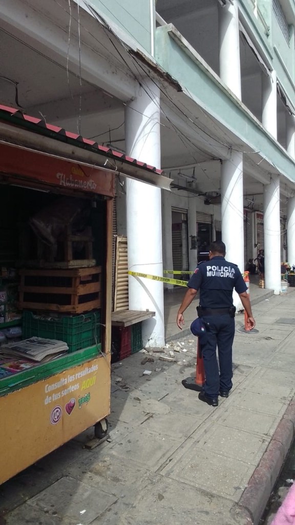 Mérida, Yucatán, sábado 28 de 2025.- El mercado Lucas de Gálvez presentó desprendimiento de una parte de cornisa de la fachada, por lo que se retiró a los vendedores ubicados en el área.