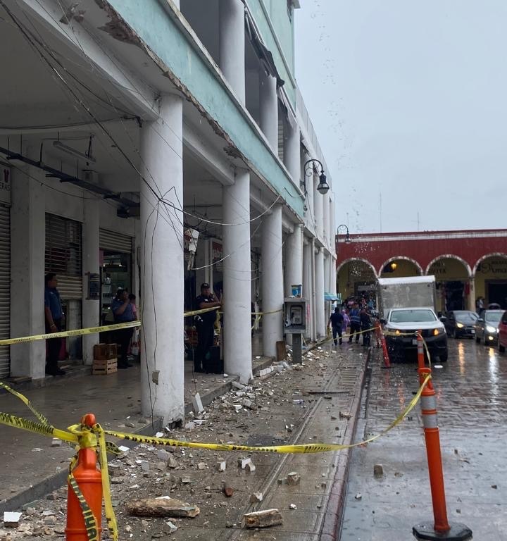 Mérida, Yucatán, sábado 28 de 2025.- El mercado Lucas de Gálvez presentó desprendimiento de una parte de cornisa de la fachada, por lo que se retiró a los vendedores ubicados en el área.