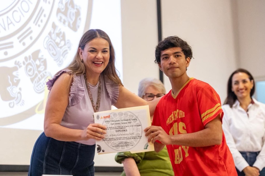 Mérida, Yucatán, martes 1 de julio de 2025.- La presidenta municipal, Cecilia Patrón Laviada asistió a la Ceremonia de Premiación de Ganadores de la Fase Estatal de la Olimpiada Nacional de Física, donde felicitó a las y los jóvenes talentos que destacaron en esta competencia.