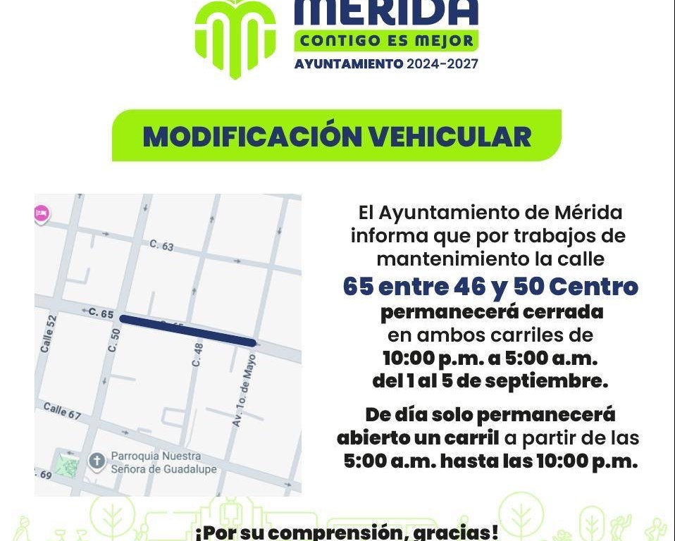 Mérida, Yucatán, lunes 1 de septiembre de 2025.- El Ayuntamiento de Mérida informa a las y los meridanos de las labores de mantenimiento de calles que se estarán realizando a partir de la madrugada de este martes 2 de septiembre sobre la calle 65 entre 46 y 50.