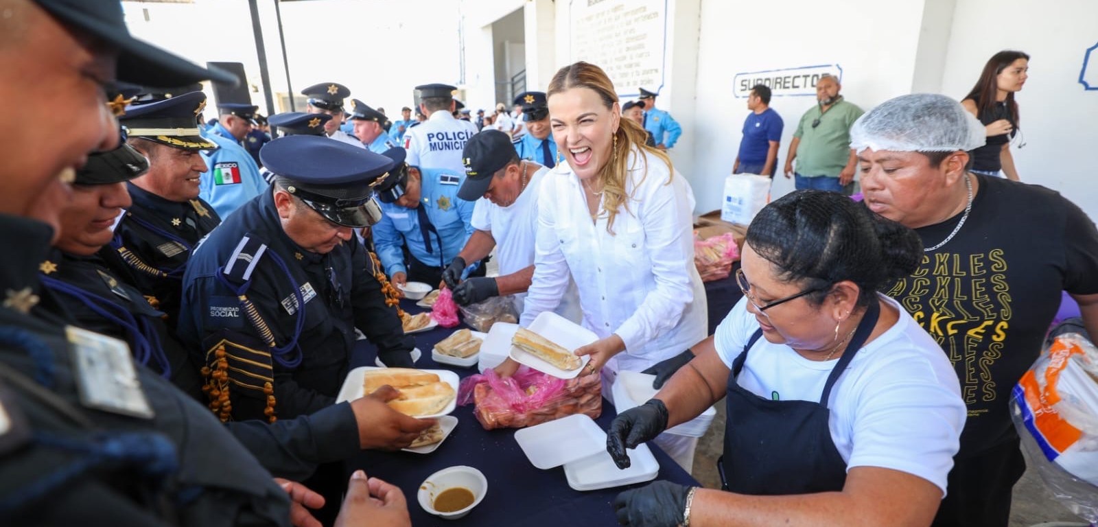 Al concluir el desfile conmemorativo, Cecilia Patrón visitó las instalaciones de la Policía Municipal de Mérida para felicitar a los elementos policiales por su destacada participación durante el desarrollo de estas actividades.