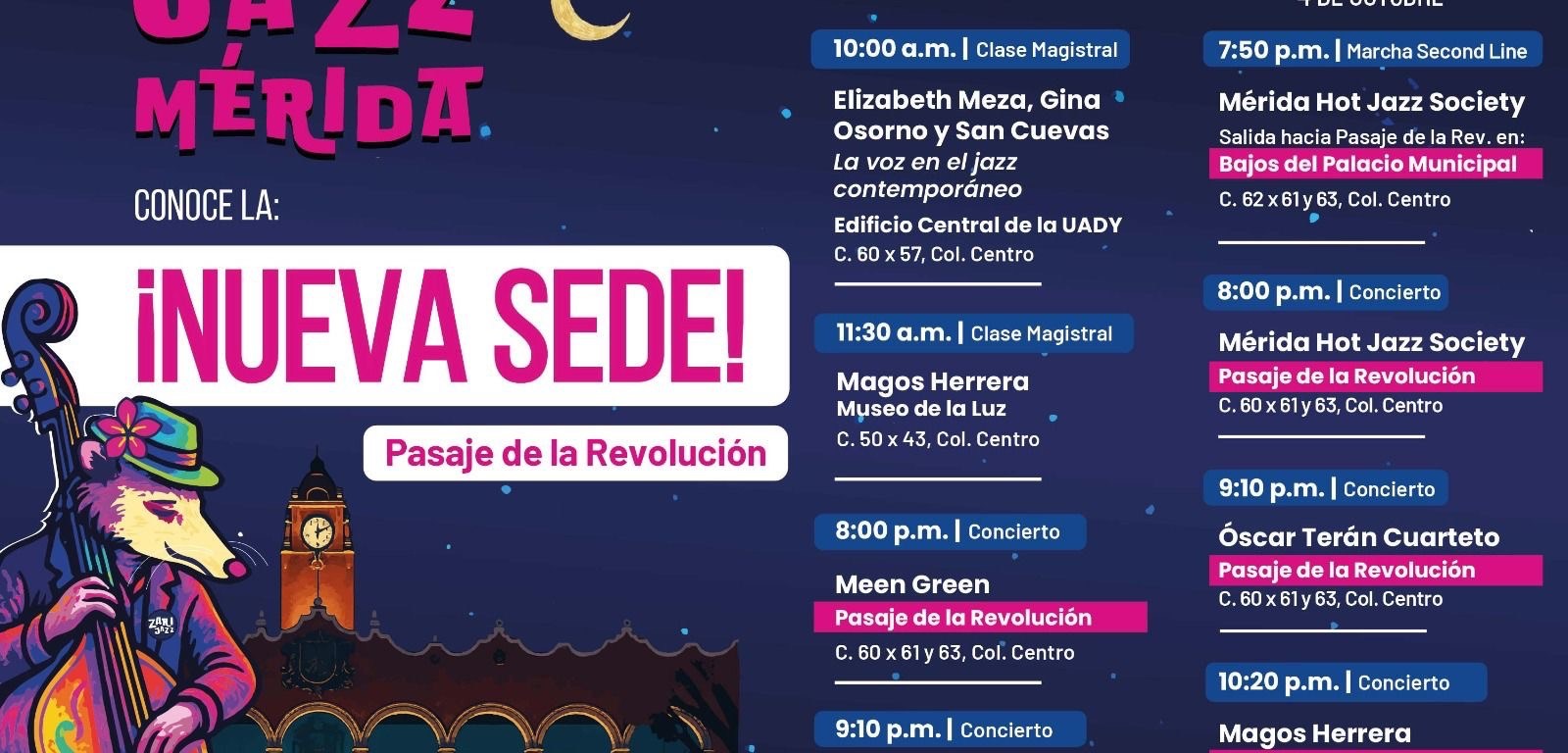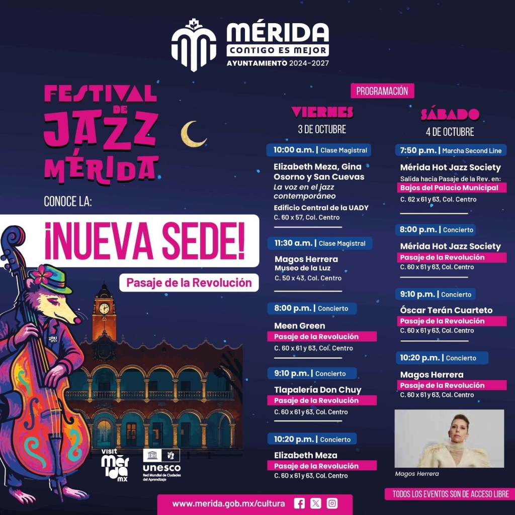 El Ayuntamiento de Mérida, a través de la Dirección de Identidad y Cultura, informa que las actividades del Festival de Jazz Mérida 2025, programadas en sedes al aire libre, se trasladan al Pasaje de la Revolución.
