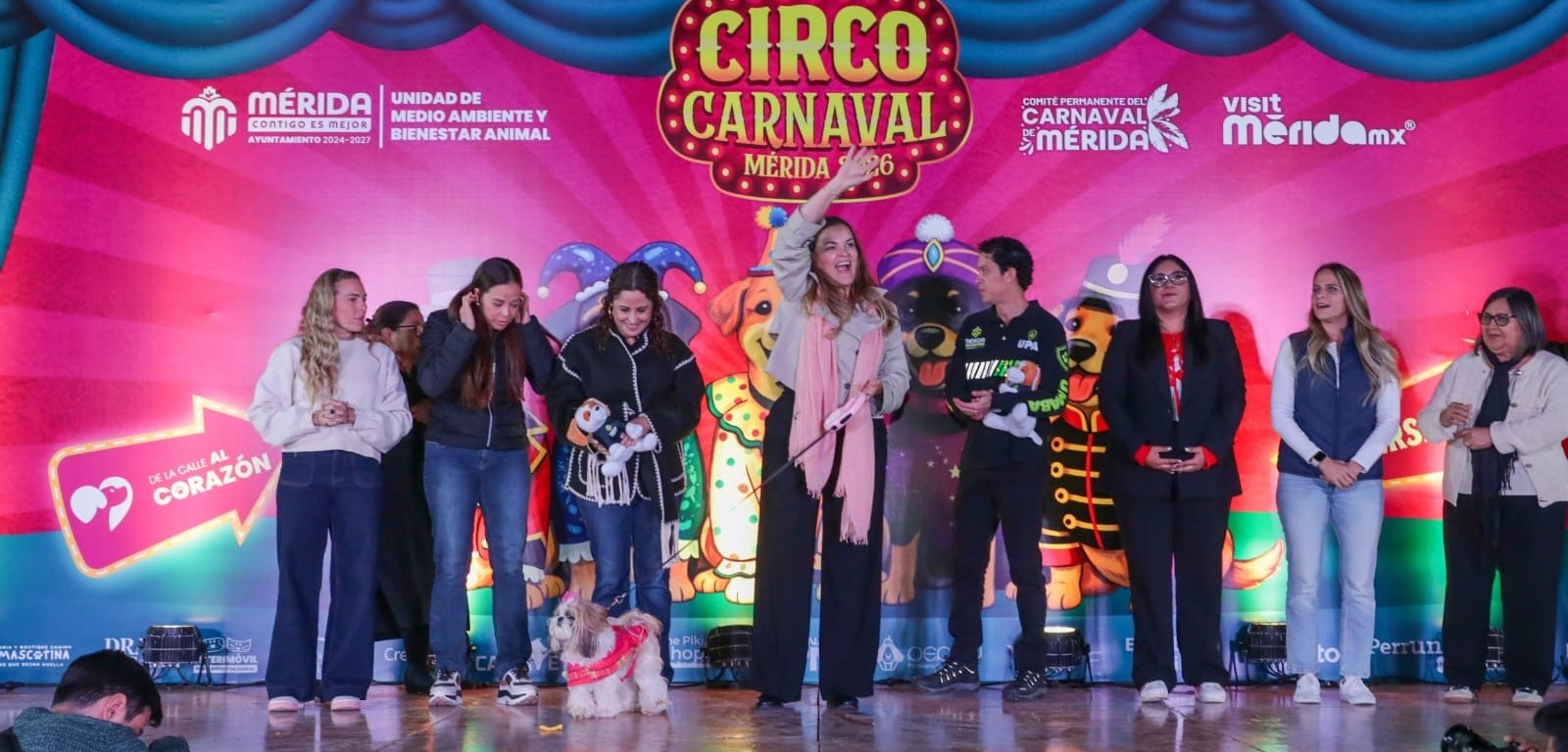 Mérida, Yucatán a domingo 1 de febrero de 2026.- La alegría del Circo Carnaval de Mérida 2026 se vivió este domingo en el Parque de la Alemán con la coronación de los Reyes Caninos, un evento que conjugó la fiesta carnestolenda con la promoción del bienestar animal, la convivencia familiar y la inclusión social, encabezado por la presidenta municipal Cecilia Patrón Laviada y los cinco soberanos caninos de esta edición.