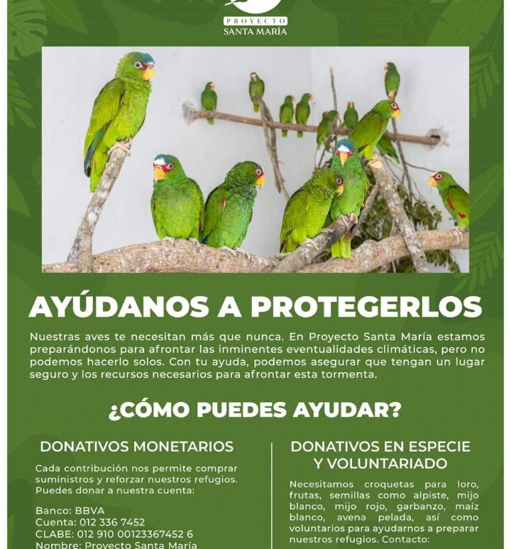 📢 ¿Cómo puedes ayudar? Donativos en especie: Frutas, semillas como alpiste, mijo blanco, mijo rojo, avena pelada, garbanzo y maíz blanco. Así como transportadoras incluso usadas para mascotas (Kennel). Dona a nuestra cuenta de banco. Cada peso cuenta. Banco: BBVACuenta: 012 336 7452CLABE: 012 910 00123367452 6Nombre: Proyecto Santa María(Centro de Difusión y Conservación Ambiental para el Desarrollo de las Comunidades PSM A.C.) El protocolo … Continúa leyendo El huracán Beryl se aproxima a la península y nuestras aves necesitan tu ayuda más que nunca. 🌳🦜