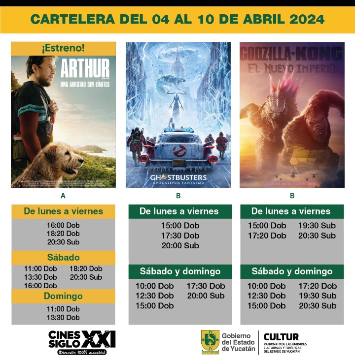 Esta es la cartelera de los #CinesSigloXXIVen a ver #ArthurUnaAmistadSinLímites🐕🐾🐾 GodzillaYKong 🦖🦍 Ghostbusters👻 KungFuPanda4 🐼 CantaYNoLlores🎤 GarraDeHierro💪 Luca🥽 Cabrini👜 Continúa leyendo CinesSigloXXI