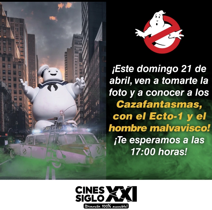 Los #CinesSigloXXI 🎬🍿 te invitan este domingo 21 a las 5 pm a ver tu película favorita 🎞️ y tomarte la foto 📸 con los #Cazafantasmas 🔫, el #ECTO1🚐 y el #HombreMalvavisco 👻 Continúa leyendo CinesSigloXXI