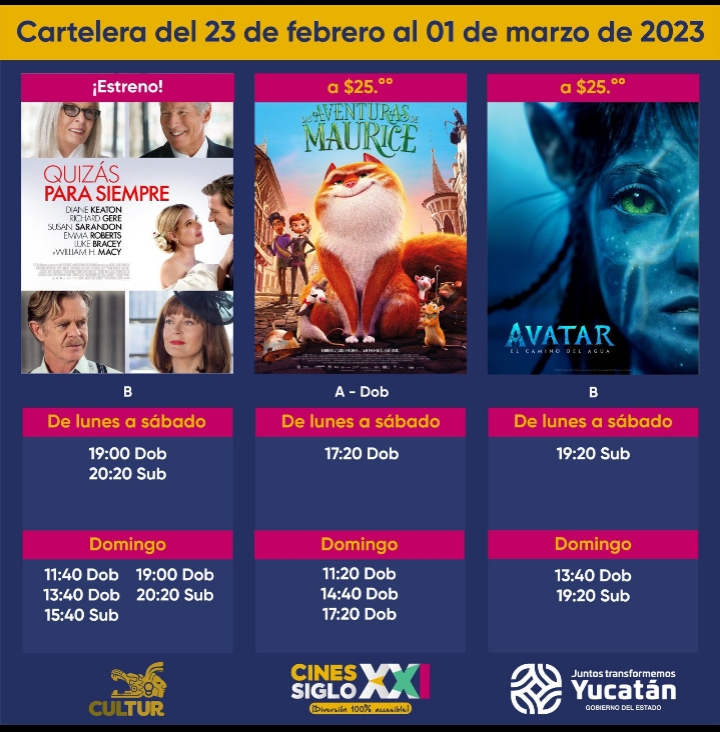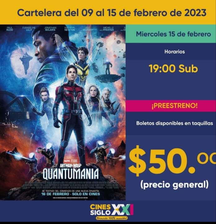Boletos en cinessigloxxi.com y taquilla de los cines1️⃣ESTRENO: Quizás Para Siempre ❤️$502️⃣Ant-Man and The Wasp: Quantumania 🐜🐝$503️⃣La Ballena 🐋$504️⃣Maquíllame Otra Vez💋💄$505️⃣Avatar 🌊 $25 PRECIO ESPECIAL6️⃣Las aventuras de Maurice 🙀🐭🐭🐭$25 PRECIO ESPECIAL CinesSigloXXI VamosAlCine SoloEnCines Continúa leyendo Esta es la cartelera de los @Cines Siglo XXI