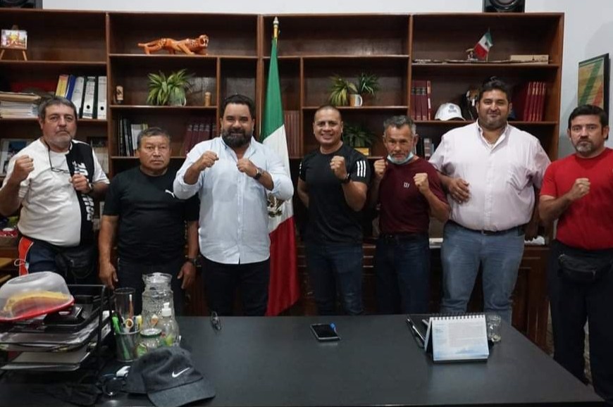 Roger Aguilar Arroyo, presidente de Motul recibe en palacio la visita de dos ex Campeones de Boxeo