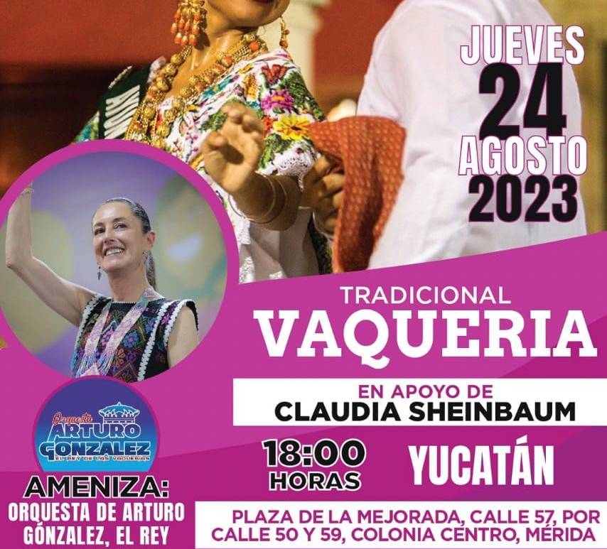 Liderazgos, enlaces municipales y distritales realizan en Plaza La Mejorada y ante miles de personas, una gran fiesta popular, con orquesta jaranera, pasacalles, voladores y jolgorio. MÉRIDA.- Con una magna vaquería, que incluyó orquesta, jaraneros, pasacalles y hasta voladores, la Red #EsClaudia en Yucatán celebró que «este arroz ya coció», por el inminente triunfo de la doctora Claudia Sheinbaum en la encuesta que se aplicará del 28 … Continúa leyendo Con Magna Vaquería, la Red #EsClaudia celebra en Yucatán que el «arroz ya se coció»