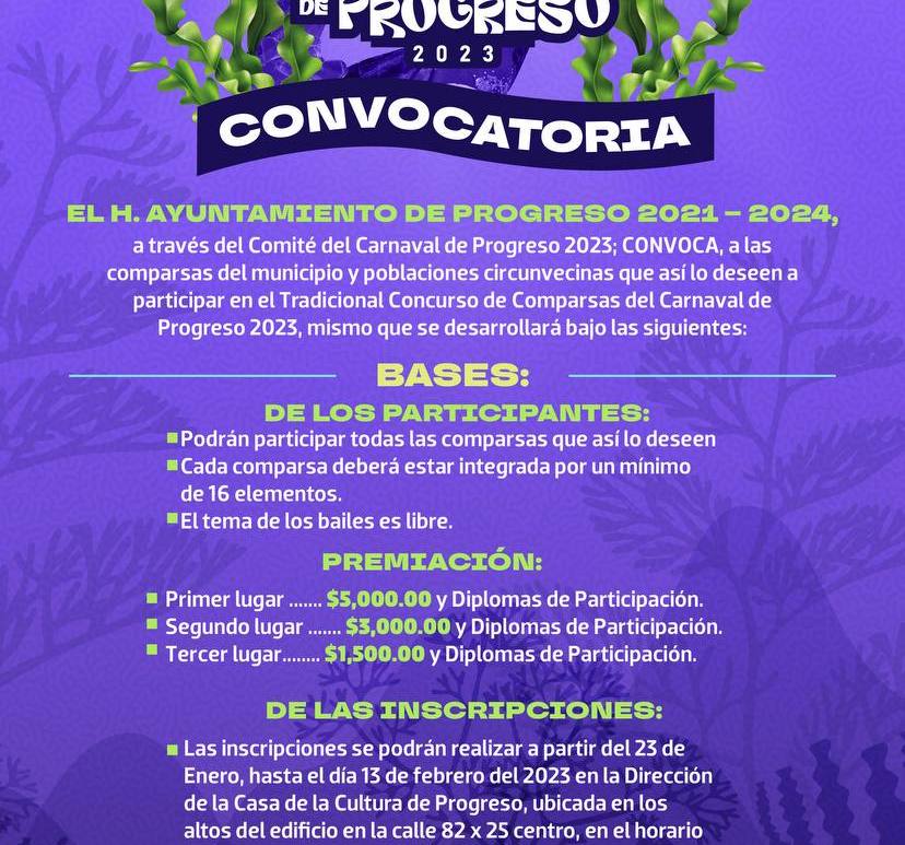 Progreso, Yucatán a 23 de enero de 2023. Uno de los eventos que refuerza las fiestas carnestolendas es el concurso de comparsas, donde niños, jóvenes y adultos, a través de música, coreografía y atuendos muestran la esencia de estas celebraciones, es por ello que el alcalde Julián Zacarías Curi e integrantes del Comité del “Carnaval de Progreso 2023” hacen una cordial invitación a grupos a … Continúa leyendo Comité del “Carnaval de Progreso 2023” invita a grupos locales y circunvecinos a inscribirse al tradicional Concursos de Comparsas