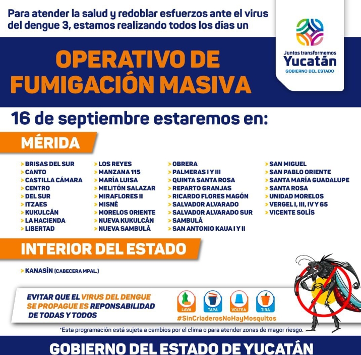 🛻💨💨💨💨💨🏠🏠🏠🏠🏠🏠 🔆Hoy martes 19 de septiembre habrá fumigación 🛻💨 en las colonias. Alemán, Azcorra, Brisas del Norte, Benito Juárez Oriente, Nueva Mayapán, Los Reyes, Manuel Ávila Camacho, Mayapán, Lourdes Industrial, Villa Fontana, Del Carmen, Chuminópolis, Waspa, Lázaro Cárdenas, Wallis, Pacabtún, Nva. Pacabtún, Salvador Alvarado Oriente, Fidel Velázquez, Nueva Chichén Itzá, Emilio Portes Gil, Chichen Itzá, Cortés Sarmiento, Emilio Portes Gil, Jardines Miraflores, Carrillo Ancona, La … Continúa leyendo Continúan las acciones contra el mosco 🦟🚫 en Yucatán. La Secretaría de Salud del Estado informa