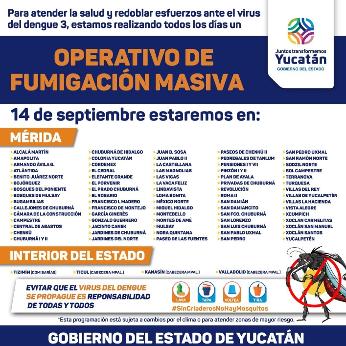 🛻💨💨💨💨💨🏠🏠🏠🏠🏠🏠 🔆Hoy viernes 15 de septiembre habrá fumigación 🛻💨 en las colonias. Alcalá Martín, Alemán, Azcorra, Brisas del Norte, Buenavista, Cervera Pacheco, Emiliano Zapata Norte, Felipe Carrillo Puerto, Itzimná, Itzimná 108, Jardines del Norte, Jardines de Vista Alegre, Las Águilas, Los Pinos, Maya y México. De igual manera se acudirá a: Miraflores, Montebello, Montecarlo, Montecristo, Montejo, Monterreal, Montevideo, Nuevo Yucatán, Petcanché, Polígono 108, Prado Norte, … Continúa leyendo Continúan las acciones contra el mosco 🦟🚫 en Yucatán. La Secretaría de Salud del Estado informa