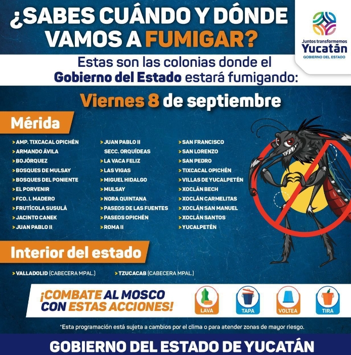 -Mediante el uso de 54 vehículos con maquinaria pesada, personal de la Secretaría de Salud del estado (SSY) cubrirá 19,375 hectáreas en beneficio de cerca de 1.5 millones de habitantes de Mérida y sus comisarías, así como de los municipios de Umán, Ticul, Valladolid, Kanasín, Tizimín y Tekax. -Las labores se desarrollan desde hoy y hasta el próximo 15 de septiembre cubriendo 19,375 hectáreas en … Continúa leyendo Gobierno del Estado intensifica labores de fumigación contra mosco transmisor del dengue