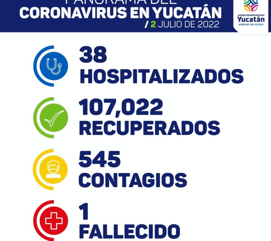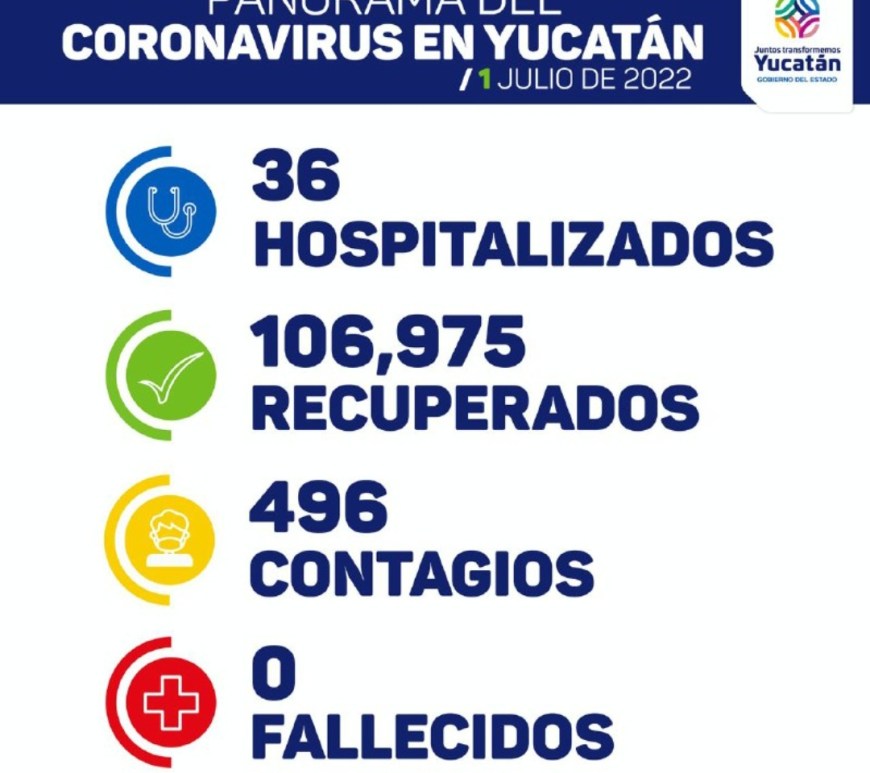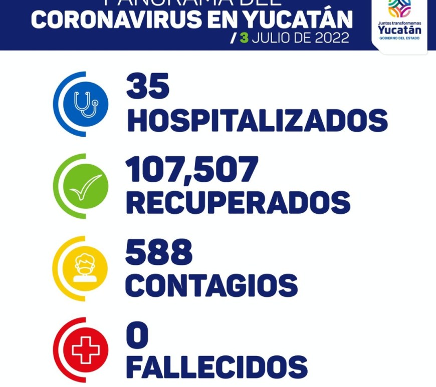 Mérida, Yucatán 3 de julio de 2022.- Este es el parte médico de este domingo 3 de julio: La aplicación de la primera dosis de la vacuna contra el Coronavirus a menores de 12 a 14 y de 5 a 11 años de edad, que viven en 10 municipios del interior del estado se llevará a cabo del lunes 4 al miércoles 6 de julio, … Continúa leyendo Hoy se detectaron 588 nuevos contagios de Coronavirus