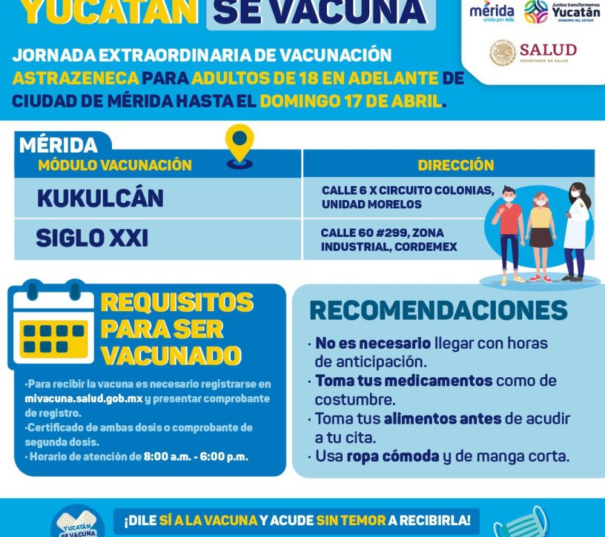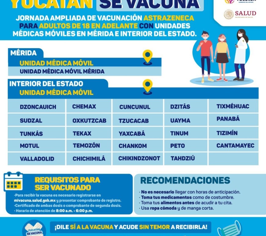 Mérida, Yucatán 20 de abril de 2022.- Este es el parte médico de este miércoles 20 de abril: Se implementará una jornada de vacunación ampliada en Centros de Salud de 30 municipios del interior del estado y se complementará con la labor de 12 unidades móviles de vacunación que se desplegarán para visitar diversos municipios y comisarías, informó la Secretaría de Salud (SSY). Se reitera … Continúa leyendo Hoy se detectaron 20 nuevos contagios de Coronavirus