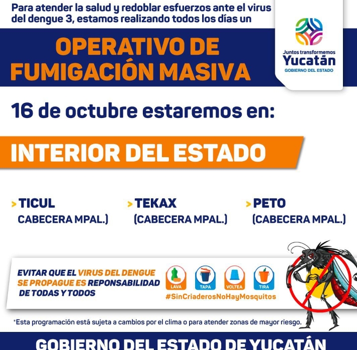 Hoy lunes 16 de octubre habrá fumigación en los municipios. *Ticul, Tekax y Peto.* ✅Cuando escuche pasar el carro fumigador deje abiertas sus ventanas para que el insecticida penetre al interior de la casa. ❌Recuerde no dejar cacharros que acumulen agua para evitar criaderos de mosquitos. Los horarios de fumigación inician desde las 03:00 horas y en el turno vespertino desde … Continúa leyendo *Continúan las acciones contra el mosco 烈 en Yucatán. La Secretaría de Salud del Estado informa