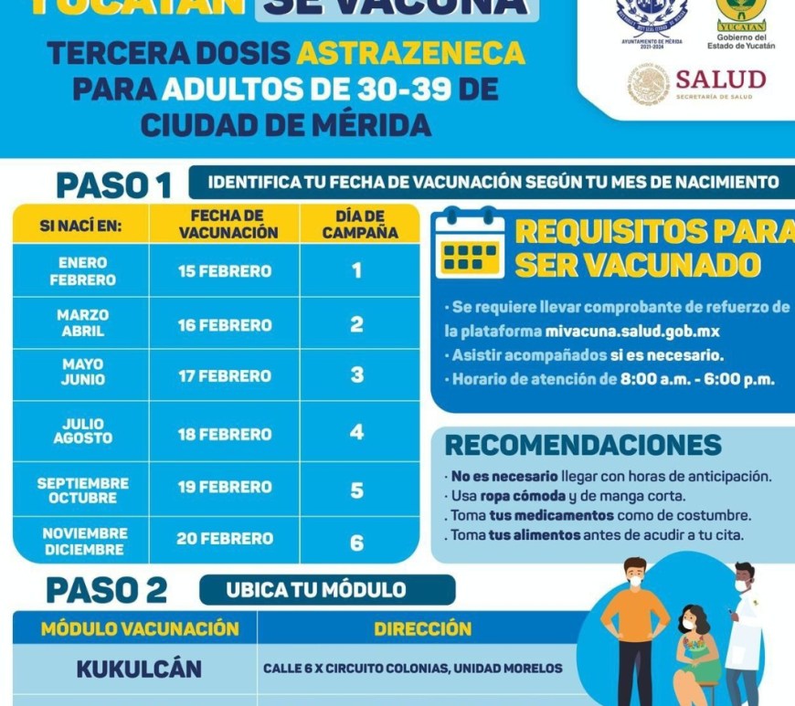 Mérida, Yucatán, 20 de febrero de 2022.- Este es el parte médico de este domingo 20 de febrero: A partir del lunes 21 y hasta el 24 de febrero iniciará una nueva etapa de vacunación para adultos de 40 a 59 años de edad de 22 municipios del interior del estado, jornada con la que en Yucatán se cubriría la vacunación de personas de ese … Continúa leyendo A partir de hoy lunes 21 y hasta el 24 de febrero iniciará la vacunación para adultos de 40 a 59 años de edad
